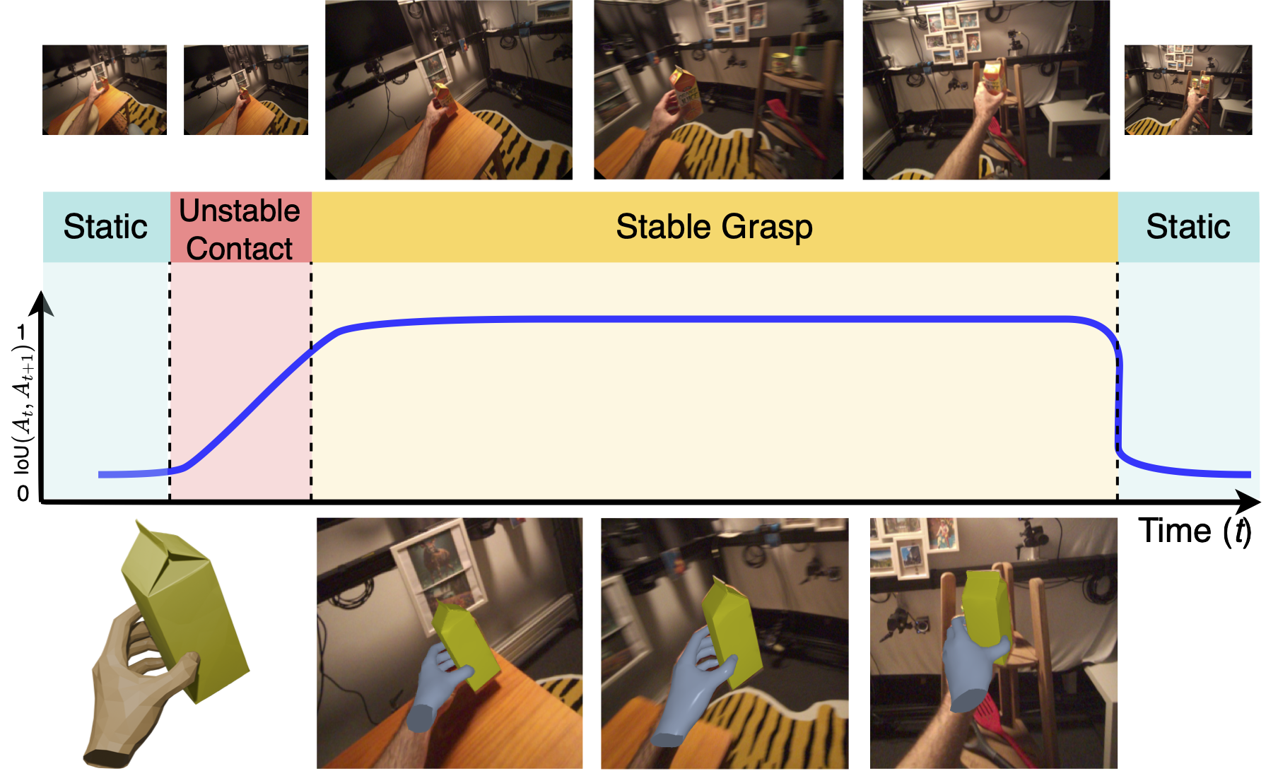 We evaluate our proposed task, ROHIT, over two egocentric datasets, HOT3D and in-the-wild EPIC-Kitchens. In HOT3D, we curate 1.2K clips of stable grasps. In EPIC-Kitchens, we annotate 2.4K clips of stable grasps including 390 object instances across 9 categories from videos of daily interactions in 141 environments. Without 3D ground truth, we utilise 2D projection error to assess the reconstruction. Quantitatively, COP improves stable grasp reconstruction by 6.2-11.3% and HIT reconstruction by up to 24.5% with constrained pose propagation.